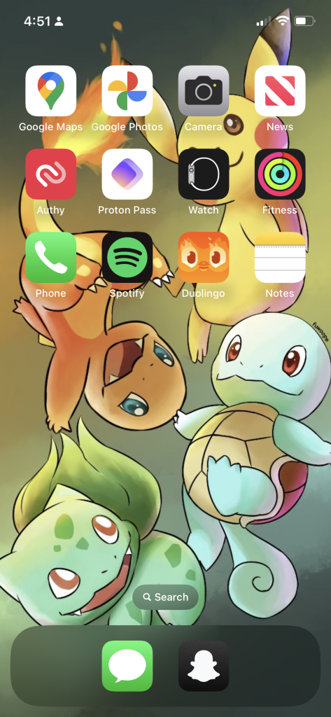 My iPhone’s home screen has gotten a bit of a redesign. I basically live on Messages and Snapchat, and literally only use both to communicate with friends and family, so those stay pinned on my dock. Then–my home screen is made up of apps I need to access when unlocking my device. Apps such as password manager I’m testing (Proton Pass), two-factor authenticator (Authy), Apple News (yes, I actually use that), Duolingo (I’m learning Spanish!), and of course my Photos app, and Maps to stalk my dad.